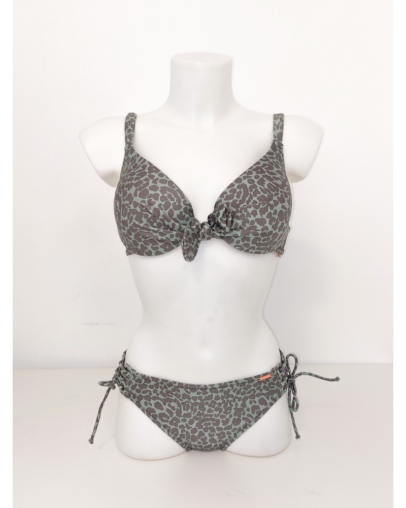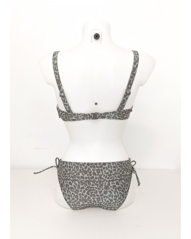 Bikini con ferretto e coppa imbottita, slip a vita bassa regolabile.