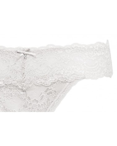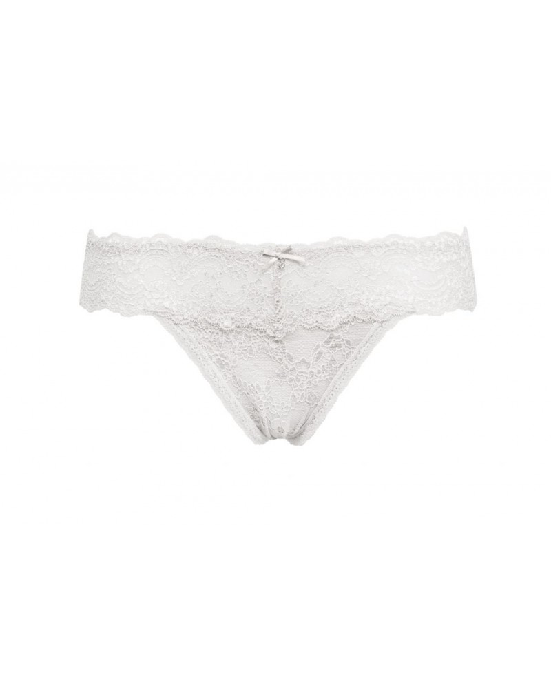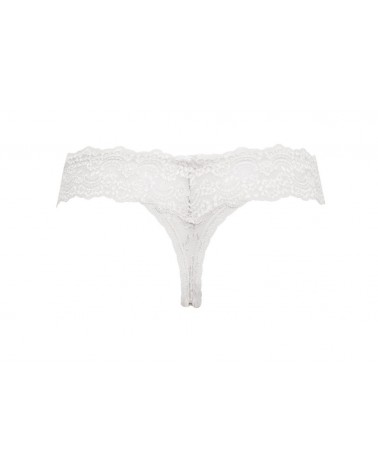 Perizoma realizzato in raffinata balza di pizzo stretch con cordonetto in rilievo a motivo floreale e impreziosito da un galloncino sempre in pizzo.